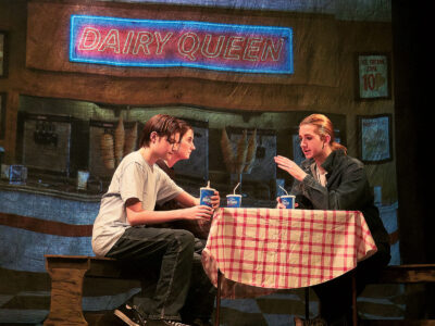 - From left, Max Taylor as Ponyboy, Lauren Smith as Johnny and Miles McGregor as Dallas in a scene at the Dairy Queen in “The Outsiders” at the Mid-Ohio Valley Players Theatre in 2025. (Photo Provided)