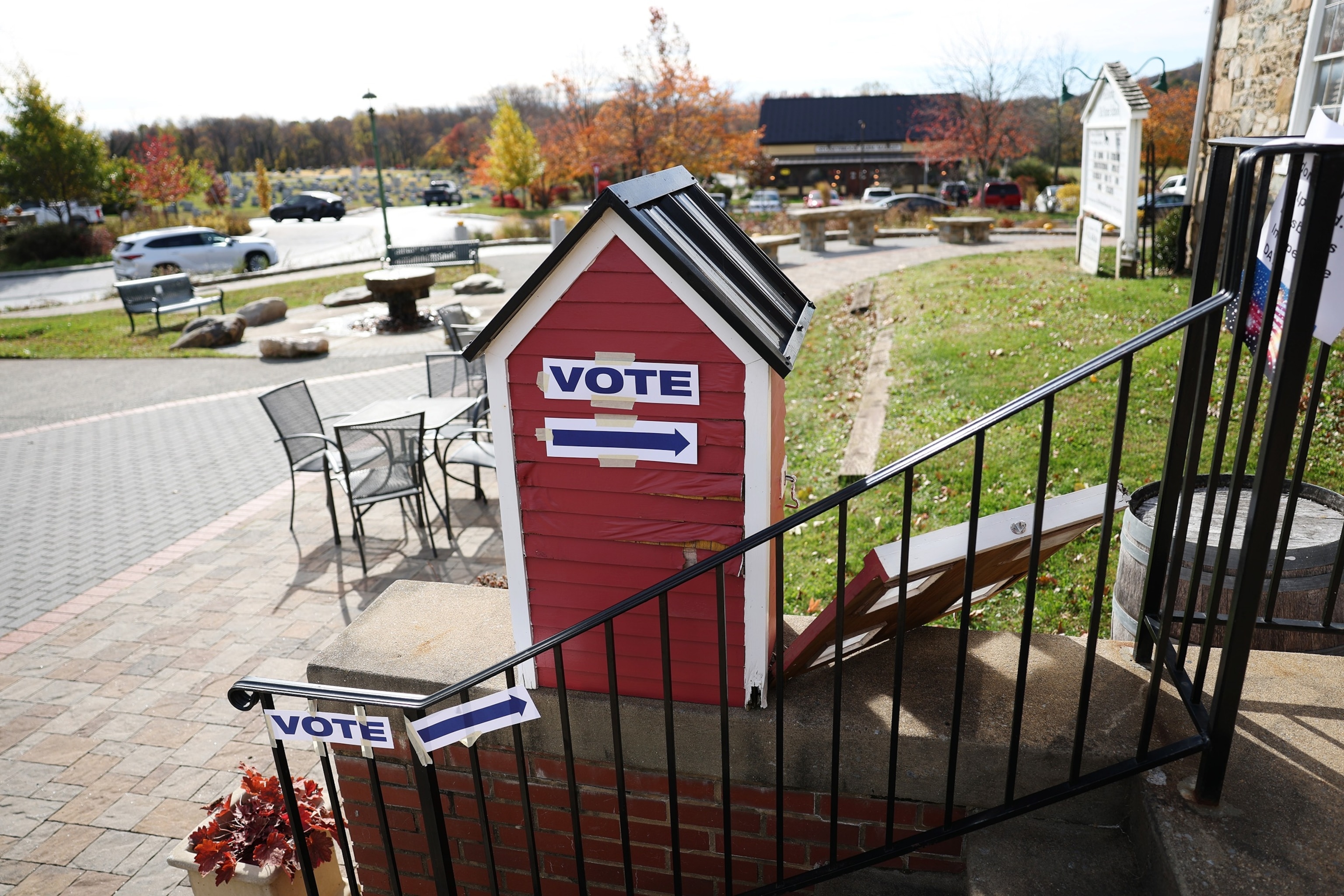 A sign points to a polling station in the Hillsboro Old Stone School, November 4, 2025 in Hillsboro, Virginia.