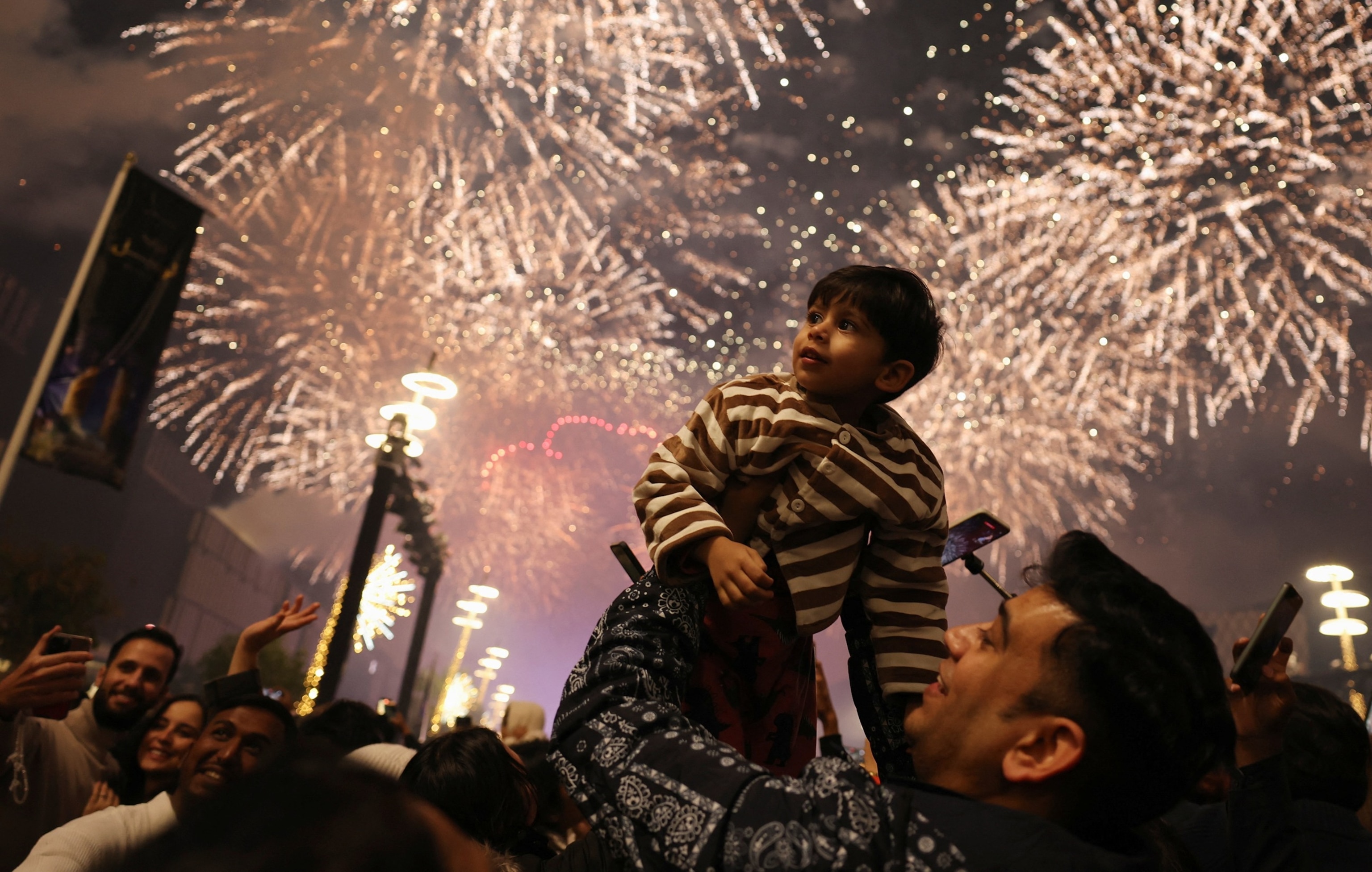 A little boy was lifted in the air to take in the fireworks in Lusail, Qatar.