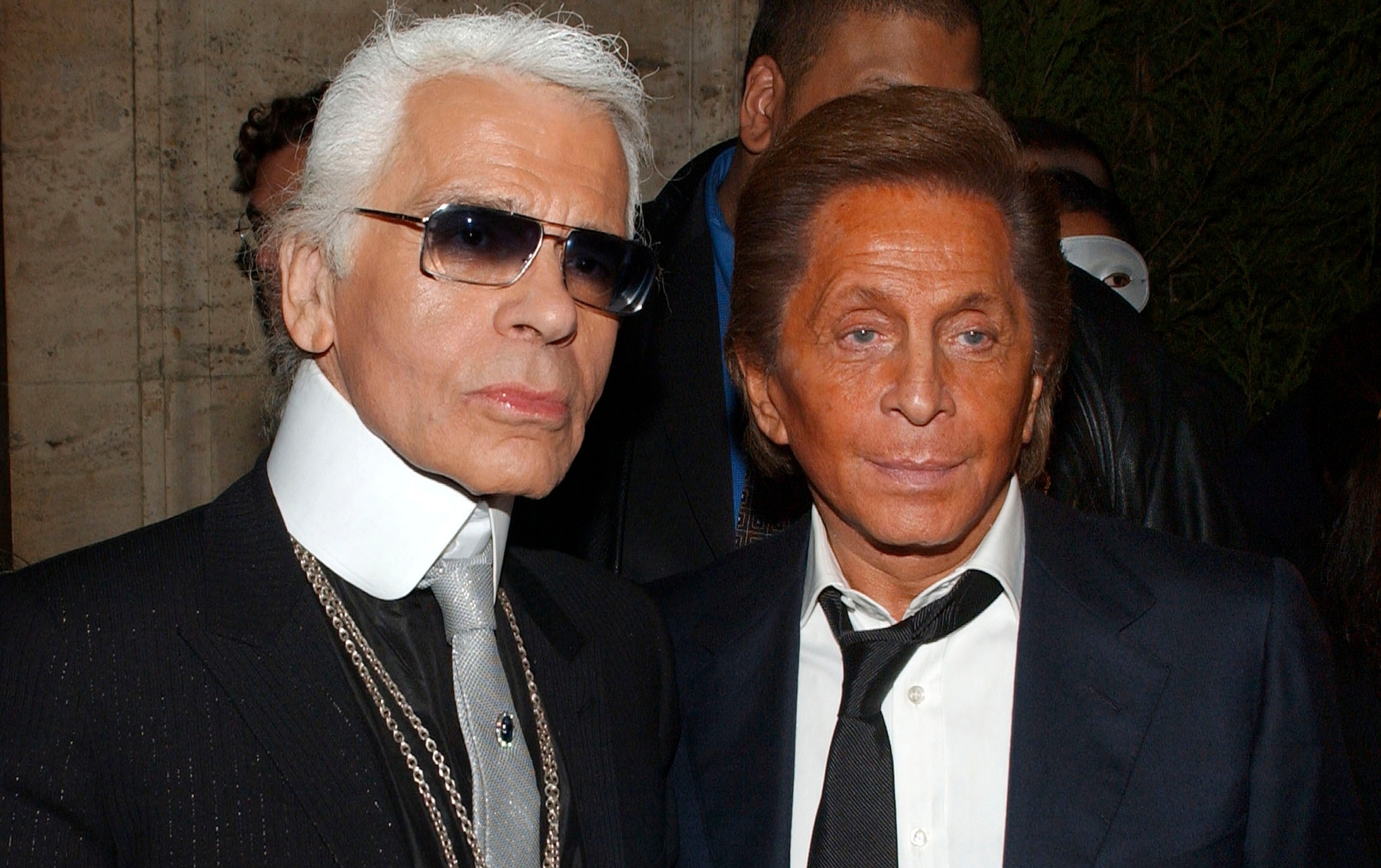 Fashion designer Valentino (R) and fellow fashion designer Karl Lagerfeld pose for a photo durning the Fendi 80th Anniversary Party Hosted By Karl Lagerfeld, October 29, 2005 in New York City.
