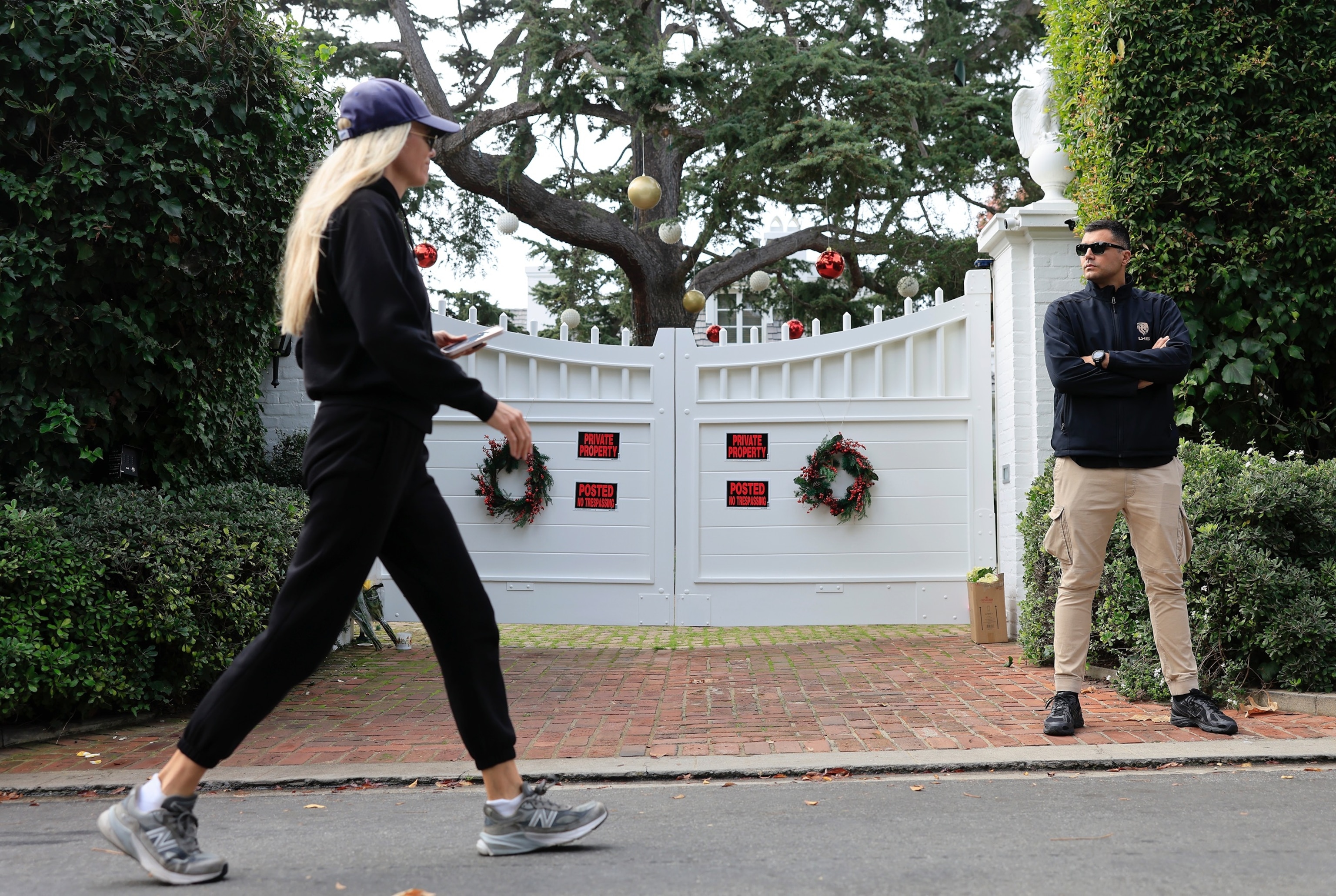 A security guard keeps watch as a pedestrian passes in front of director Rob Reiner’s home on Dec. 16, 2025 in Brentwood, California.